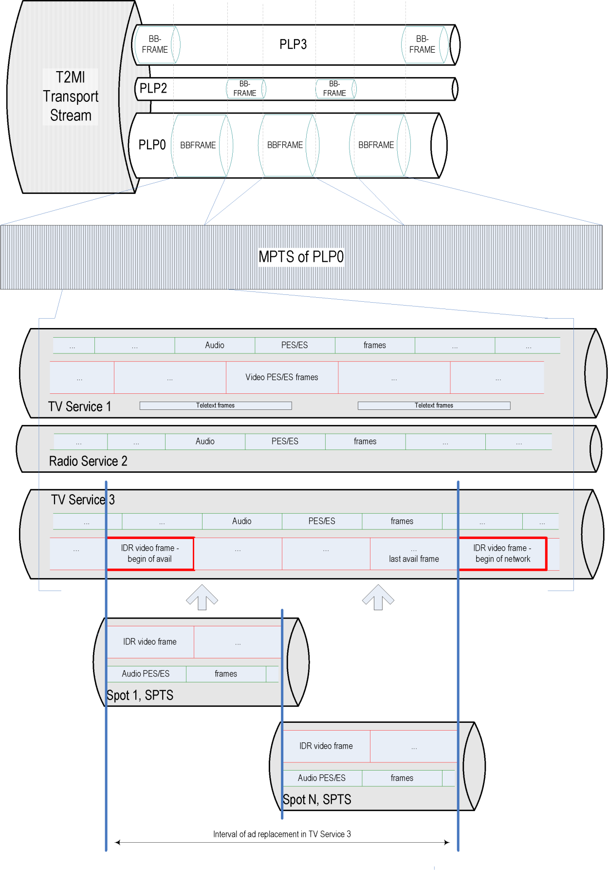 Below is an illustration of the described splicing algorithm for T2MI streams at the physical layer, where BB-frame is the data of various PLPs.